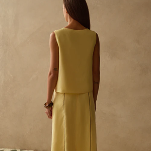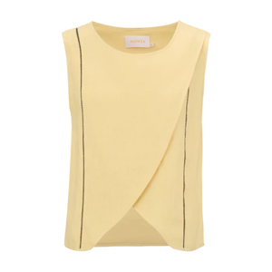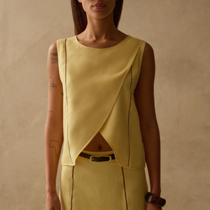 Presentamos el top Nancy: una versión sofisticada del clásico top sin mangas. Adornado con costuras en contraste, este elegante diseño presenta un original frontal superpuesto que realza un cinturón llamativo. Combínalo con la falda Indy para un conjunto elegante y sofisticado.