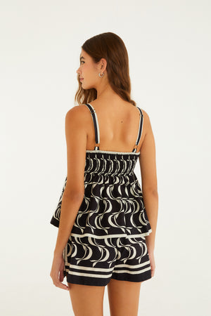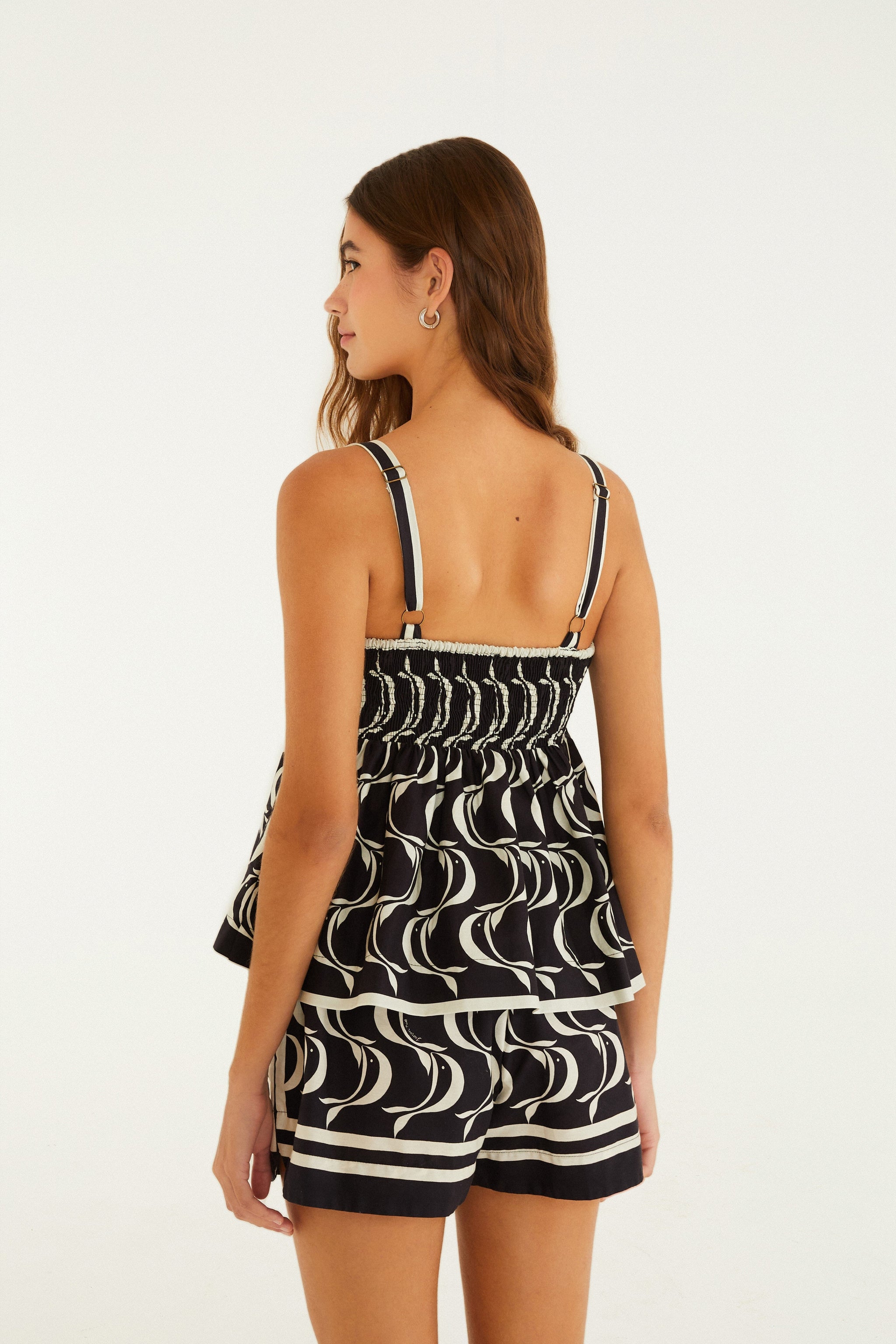 Blusa con estampado de peces copa. Con tirantes finos y un escote recto que realza la prenda, está confeccionada en un tejido ligero, ideal para días calurosos. Su corte holgado y cómodo proporciona ligereza y movimiento. Perfecta para un look casual, tanto en la ciudad como en la playa. FARM RIO Original - Verano 26.