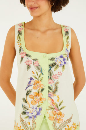Chaleco con estampado floral natural. Esta prenda combina a la perfección estilo y comodidad, con escote redondo y una base de tejido ligero que aporta frescura. Su corte holgado garantiza libertad de movimiento, ideal para salidas informales o un brunch en el parque. Los delicados detalles realzan el look. FARM RIO original - talla 26 de verano.