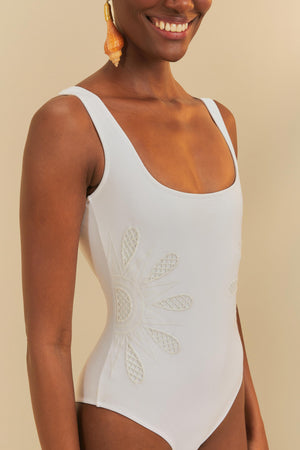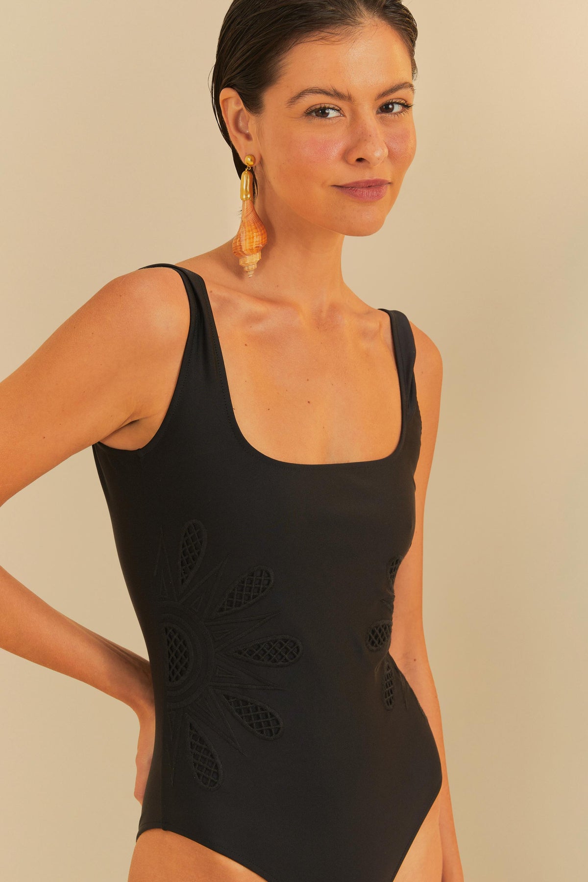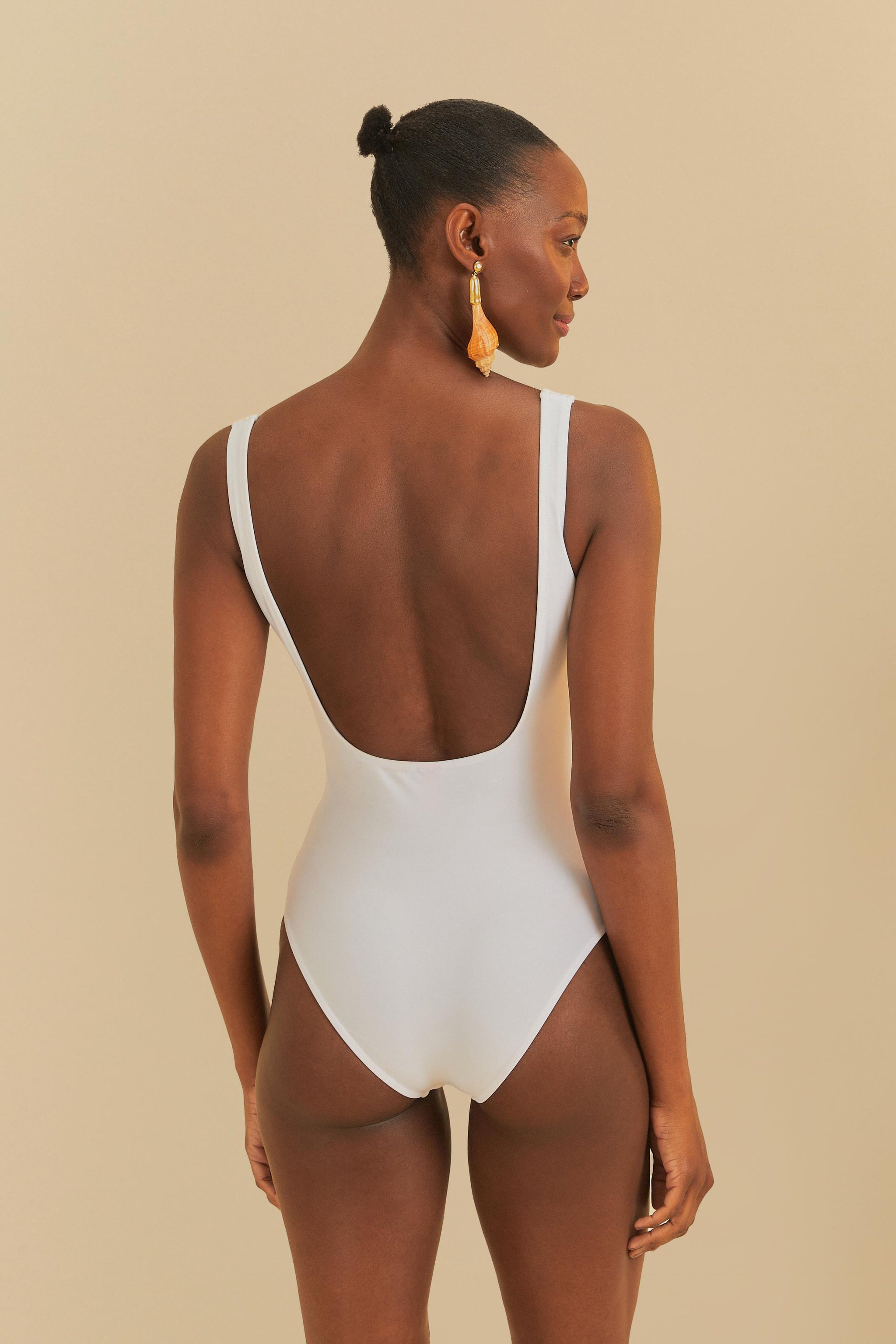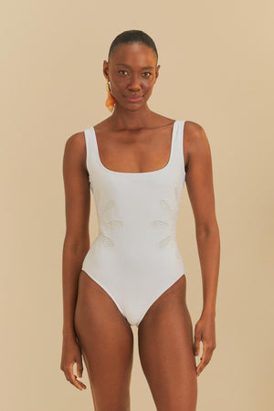 Handcrafted richilieu swimsuit. Sophisticated design with square neckline and wide straps that offer comfort and style. Features handcrafted richilieu details that elevate the piece, making it a perfect choice for moments by the sea or poolside. A unique farm touch that transforms any occasion into a special experience. Original farm rio - winter 25.