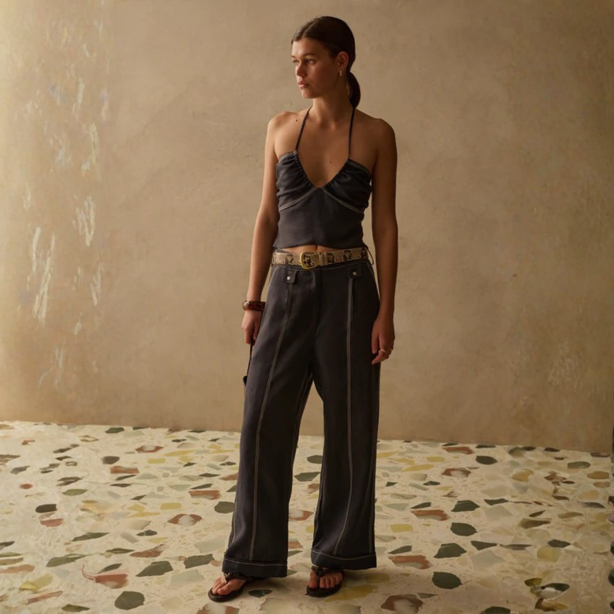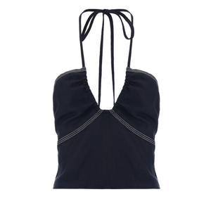 El top Makena es perfecto para las vacaciones: un look playero y desenfadado. Con escote halter, fruncido en el busto y espalda fruncida, este top es cómodo y relajado a la vez que elegante. Los detalles dorados en forma de concha en los extremos de los lazos le dan un toque especial.