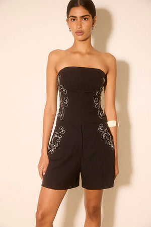 - BLENDED LINEN FABRICATION - STRAPLESS BODICE - FITTED SILHOUETTE - FEATURED PLACEMENT EMBROIDERY - PRINCESS PANEL SEAMS FOR SHAPING - ELASTICATED SHIRRING SIDE BACK PANELS - CENTRE BACK LAPPED ZIPPER CLOSURE - FULLY LINED - DESIGNED TO PAIR WITH ZAHRA SHORT