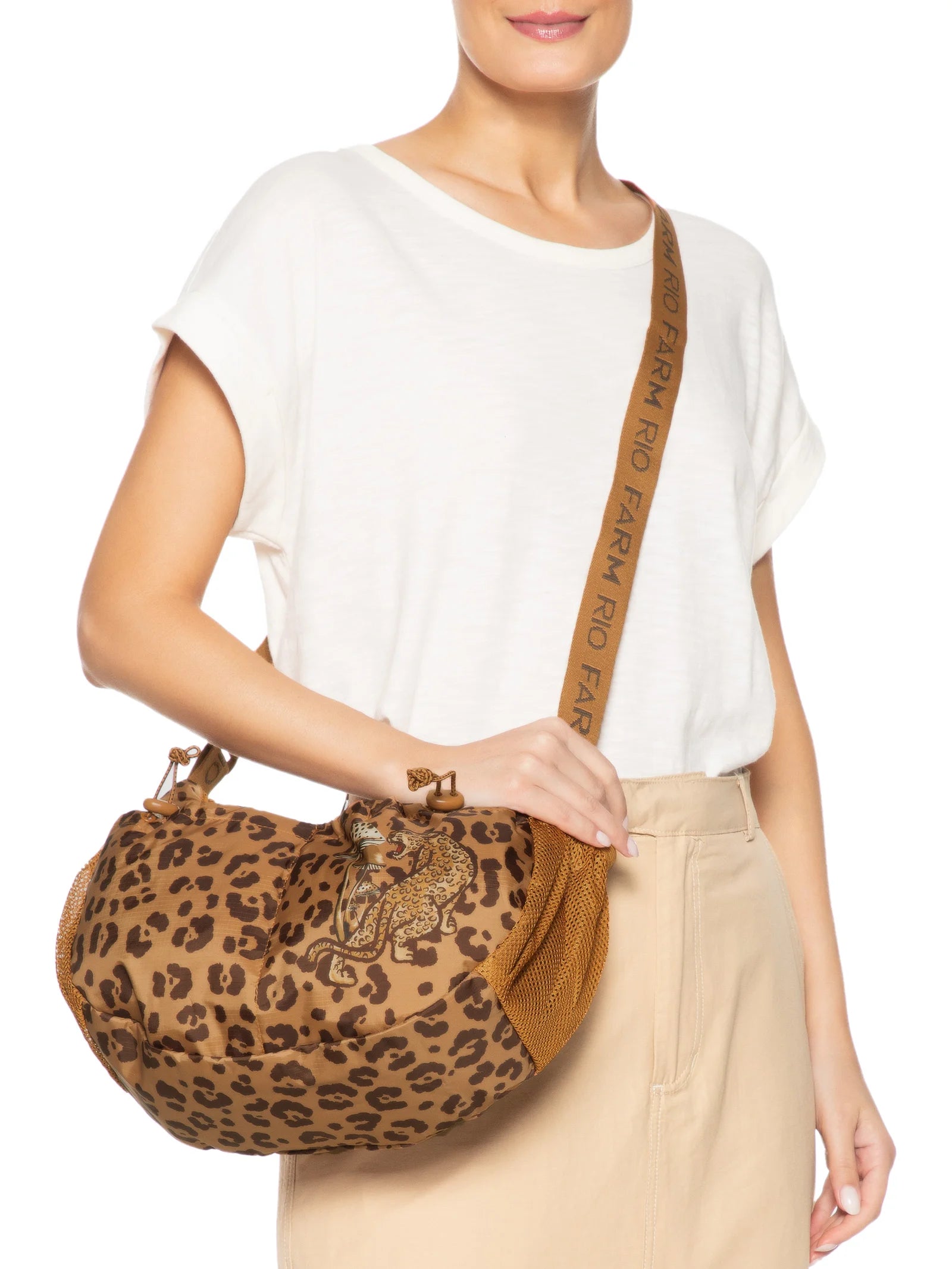 Casual sporty bag with a main opening secured by a zipper. Two small front pocket supports with elastic stopper closures. Side mesh pockets for holding a bottle. Adjustable strap for crossbody use.
