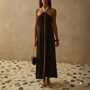 El vestido Savannah presenta una silueta minimalista de corte lencero. Con paneles en contraste y un elegante escote halter, esta sofisticada prenda de silueta fluida es perfecta para quienes buscan un vestido de corte relajado que les permita sentirse cómodas y a la vez elegantes.