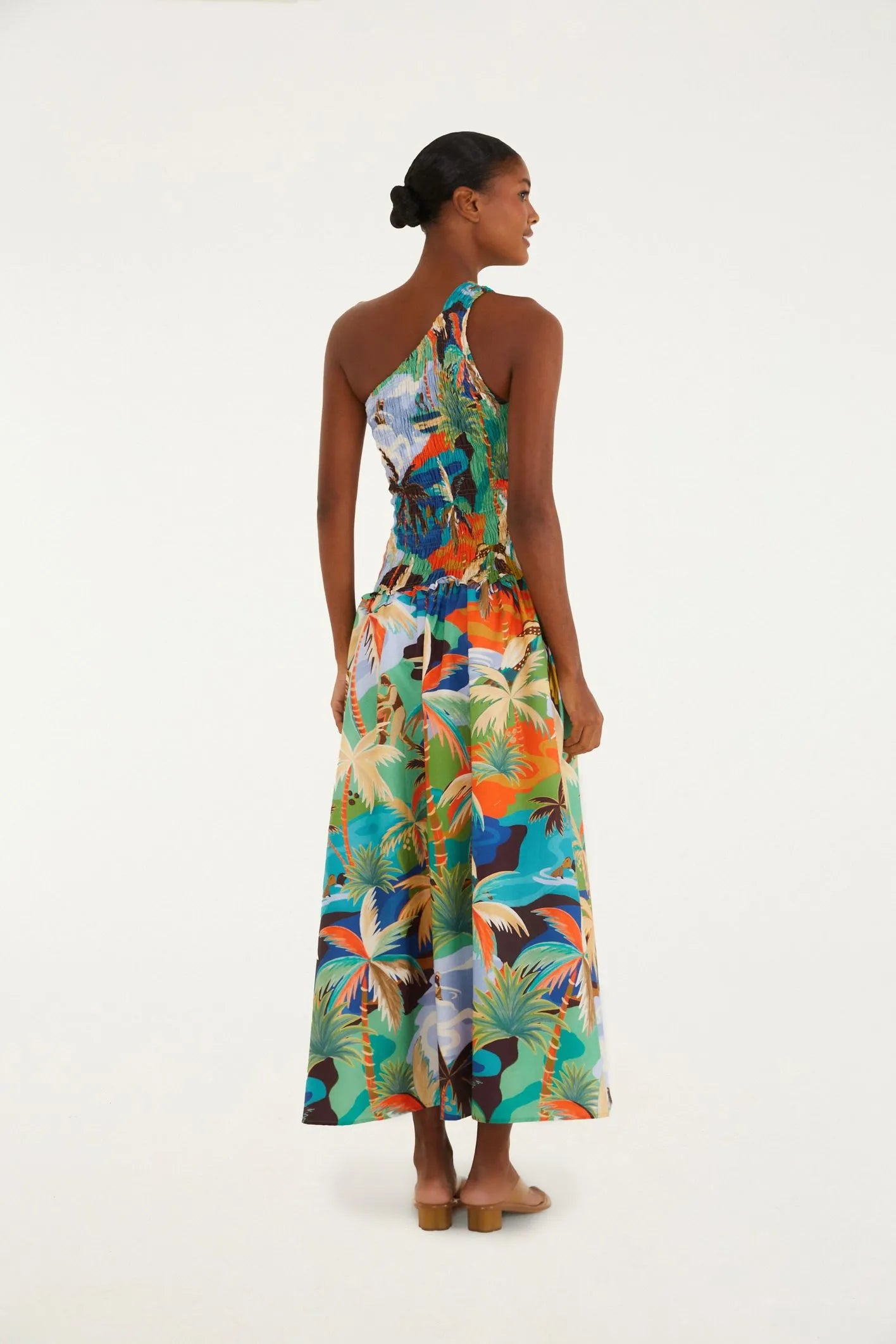 The "Bem Querer" printed dress, with its single strap and off-the-shoulder design, offers a modern and surprising touch. The piece has a light drape with a flowing skirt and natural movement. The tie detail at the bust adds charm to the look. Perfect for casual occasions or a stroll by the sea.
