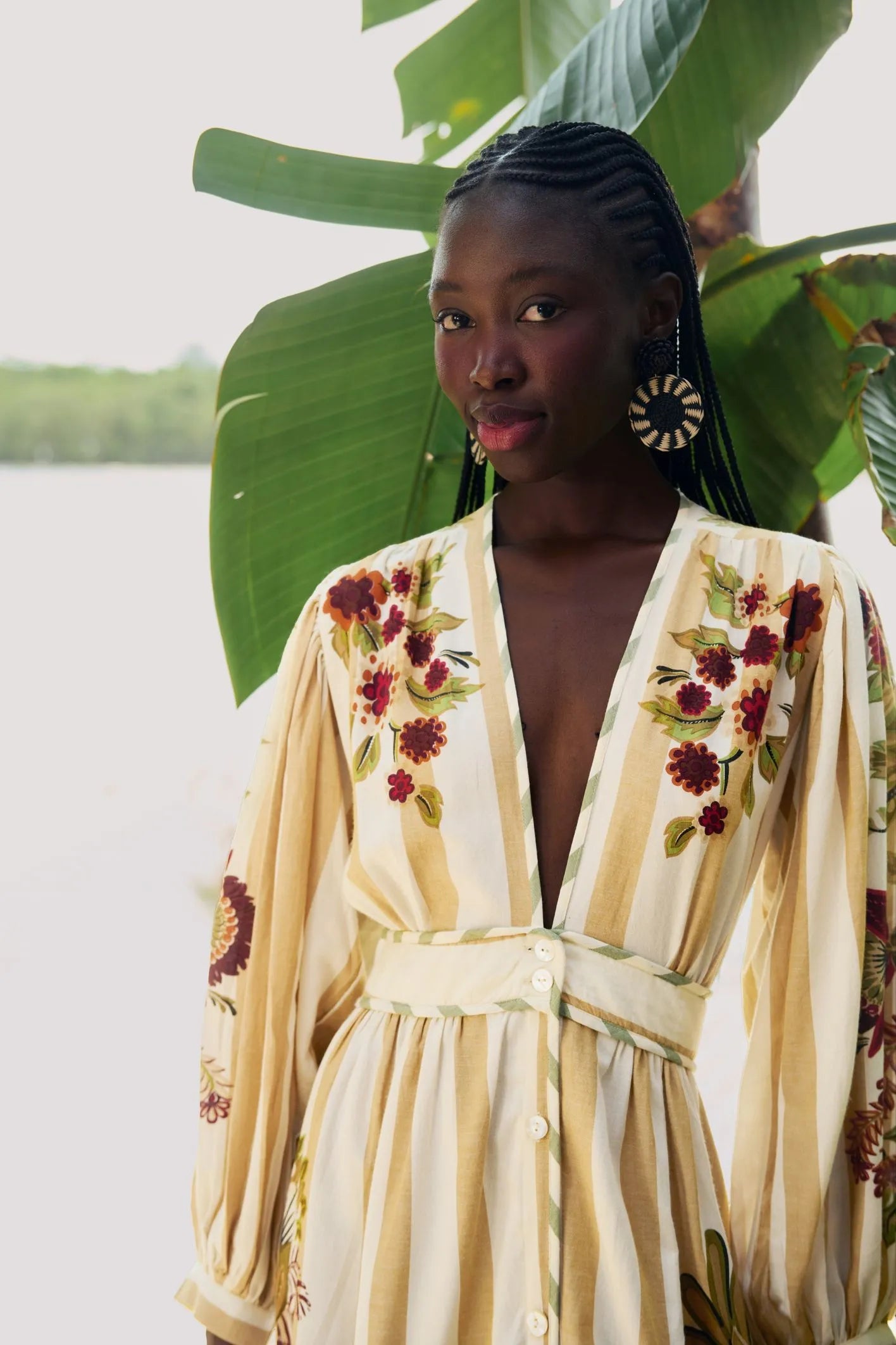 Ligia floral print dress with sleeves. It features a delicate V-neck that descends to a subtle tie, while the puff sleeves with elasticated cuffs add an extra touch of charm. The flowing design provides comfort for any occasion, from a stroll by the sea to brunch. A unique and versatile piece for all hours.