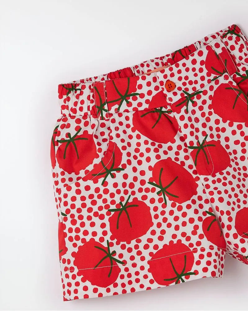 Children's shorts made of 100% cotton fabric with buttons and pins on the waist, bags, elastic on the edges, vibrant tom seams and the designs of the Colheita print.