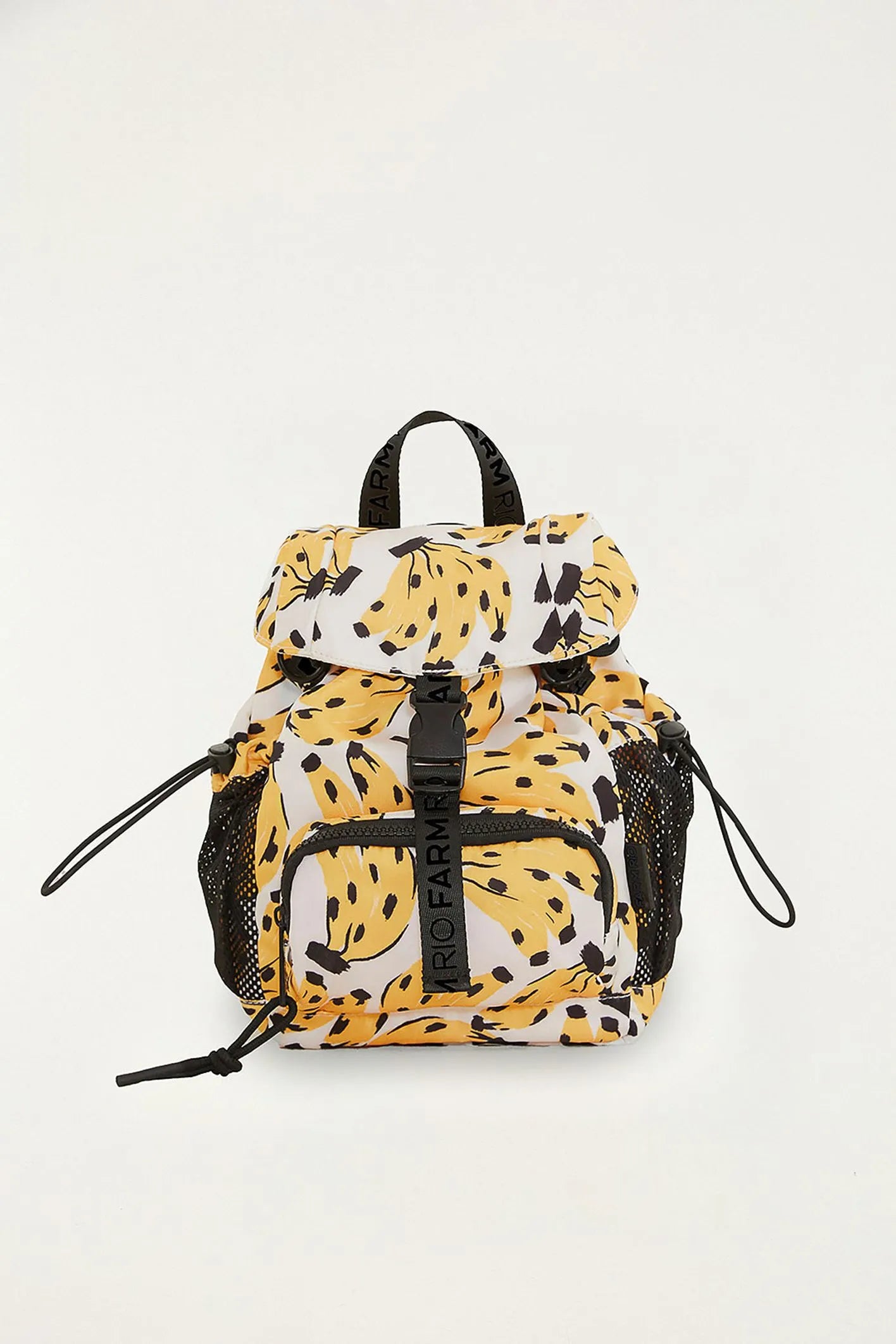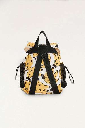 Popcorn bag, Bossa Banana, off-white. Backpack made of nylon with overlapping front flap, medium grosgrain straps with the brand name embossed on the front, front pocket, side mesh pocket with adjustable pull, long grosgrain strap with the brand name embossed and adjustable, flat base, textile lining and top closure with zipper and front snap buckle. What you don't wear, you live.