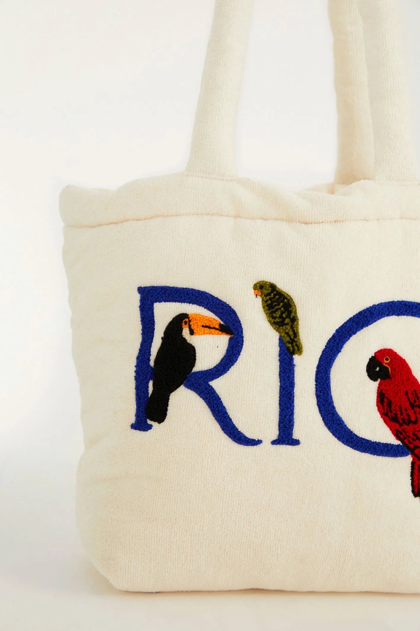 Farm Rio off-white sun bag. Ideal for sunny days. Made of terry cotton with a thread embroidery effect, adding texture to the piece. What you don't wear, you live.