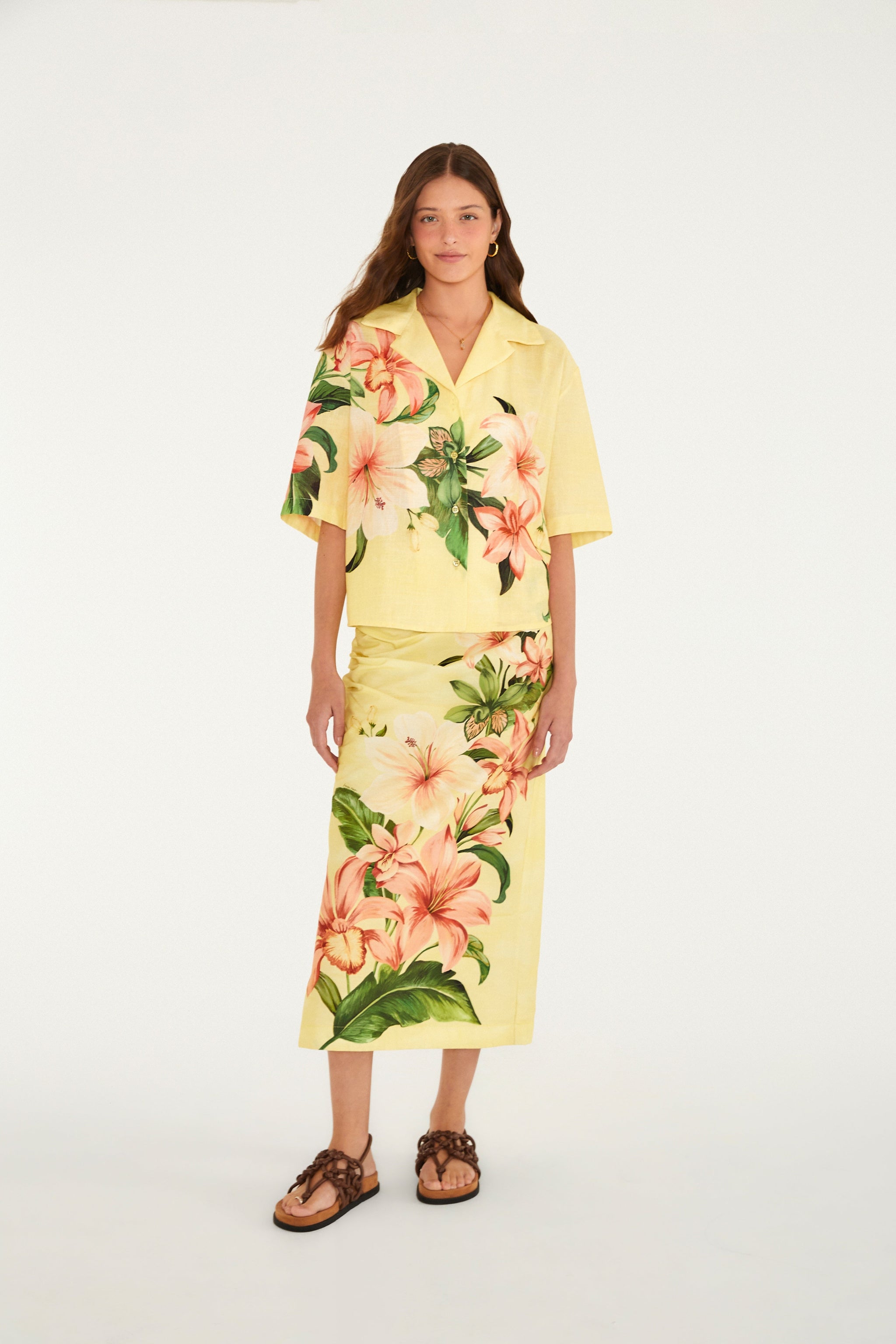 Falda Floribel. Una pieza que captura la ligereza y originalidad de la marca. Su caída larga y fluida es perfecta para crear un look casual con movimiento. Los detalles fruncidos en los laterales aportan un encanto extra, ideal para paseos al aire libre o encuentros especiales. FARM Rio, colección Carioca - invierno 26.