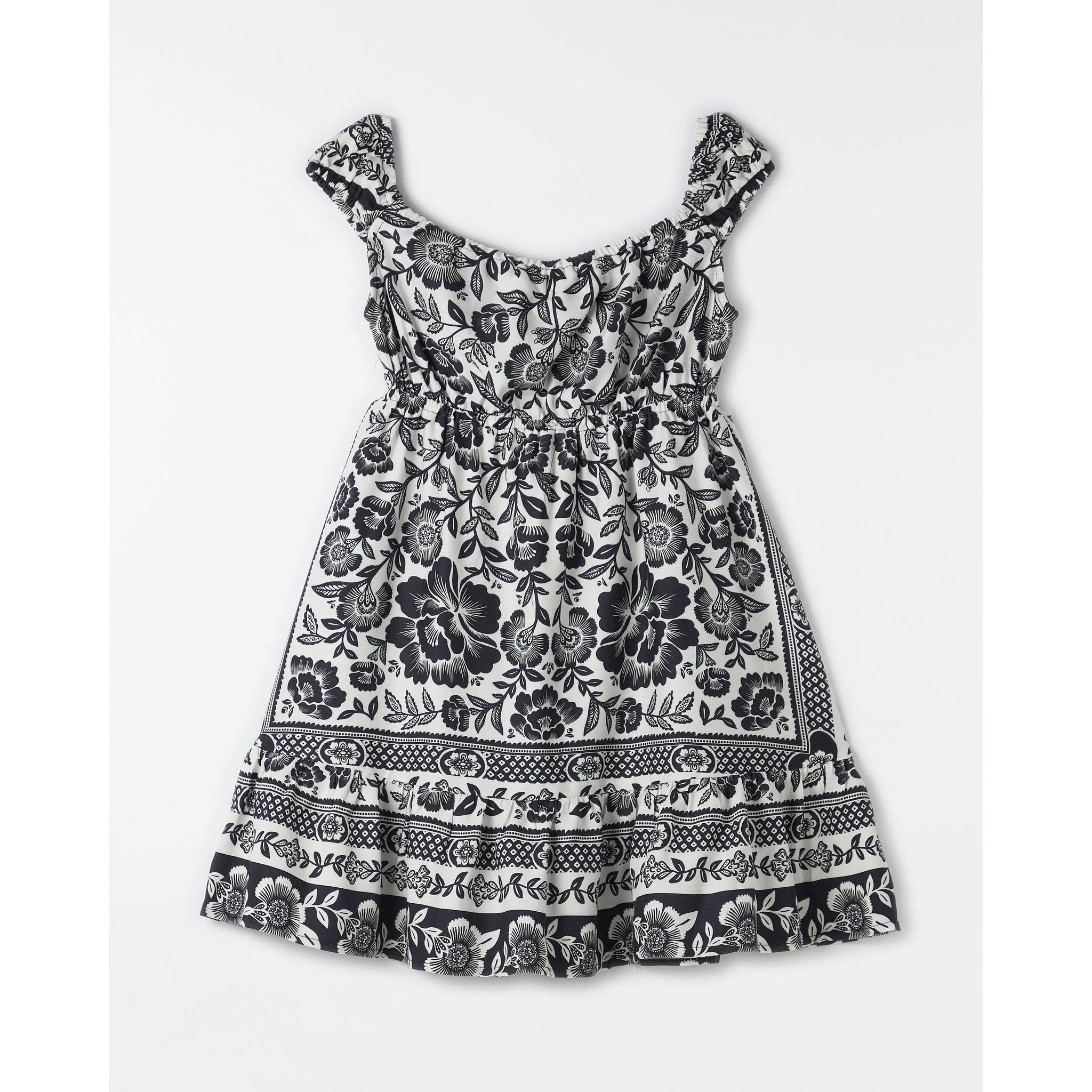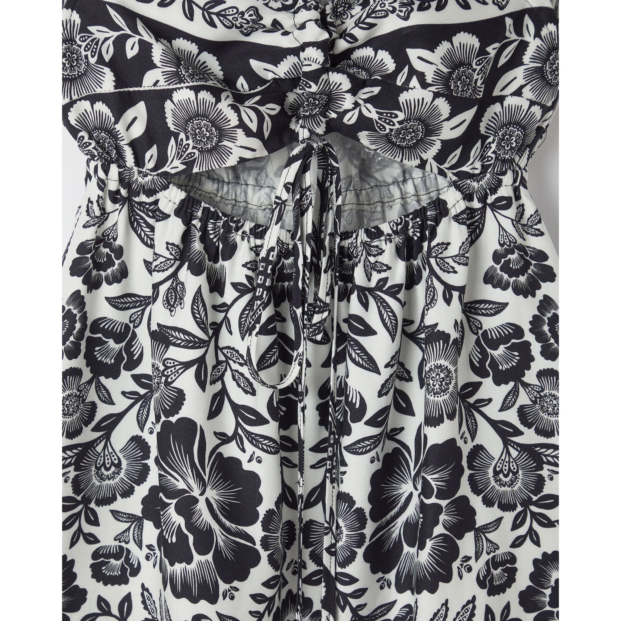 Dress with the B&W drawings of the Jardim Romance print. The clothing, part of the FARM Futura line, combines comfort and style in a unique way. It has a cutout with adjustable ties at the back, a gypsy neckline, straps, elastic at the waist and an A-line skirt with hem. Perfect for an outdoor walk.