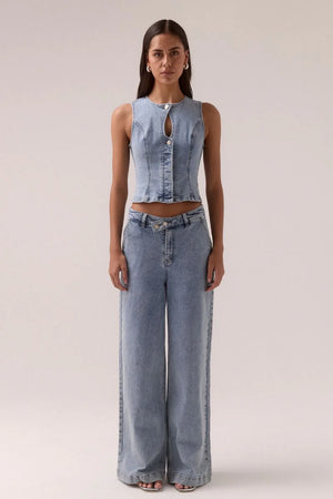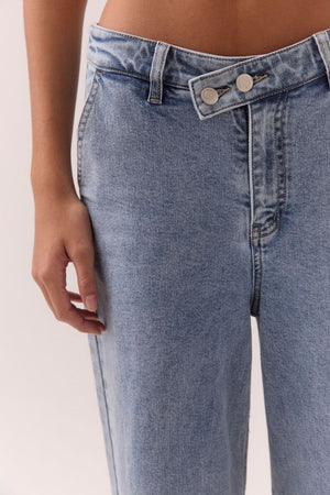 - Denim fabrication- Waisted denim pant with angled front waistband- Wide leg- Fly front closure with double button detail- Front angled pockets- Back welt pockets