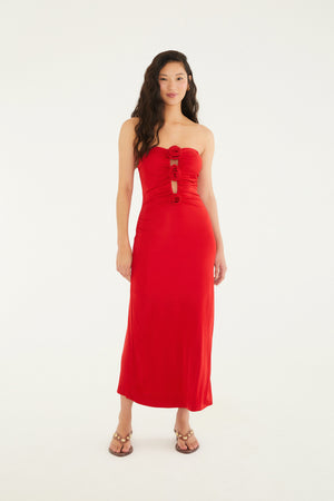 Vestido de jersey floral con escote pronunciado. Su diseño sin tirantes y hombros descubiertos rebosa encanto. El escote centrado se remata con un delicado lazo. Confeccionado en un tejido ligero, ofrece movimiento fluido y frescura. Perfecto para salidas a la playa o reuniones informales. FARM RIO Original - Verano 26.