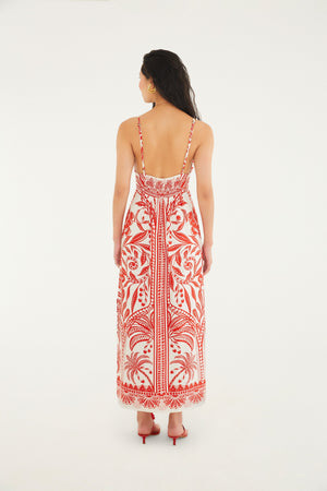 Vestido midi con estampado de flores de cocotero. Confeccionado en viscosa ligera, presenta tirantes finos y un delicado escote en V que realza el busto. El bajo de encaje y el estampado único le dan un toque especial. Perfecto para un paseo junto al mar o una cena informal. FARM RIO Original - Verano 26.