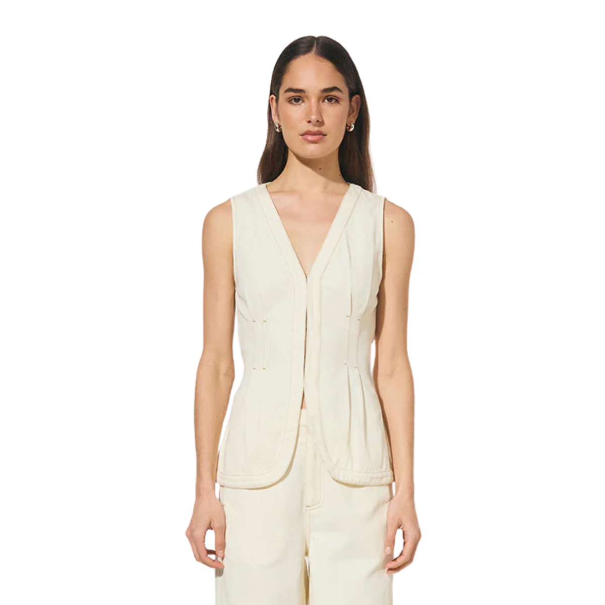 Top tipo chaleco de denim sin mangas, diseñado con una silueta alargada que estiliza y alarga la figura. Presenta escote en V, bajo frontal curvo y detalle de pinzas en la cintura, ofreciendo un ajuste estructurado pero relajado, perfecto para usar en capas o como pieza protagonista. El lazo ajustable en la parte posterior de la cintura permite personalizar el calce, mientras que las costuras en contraste realzan su estética de denim estructurado.