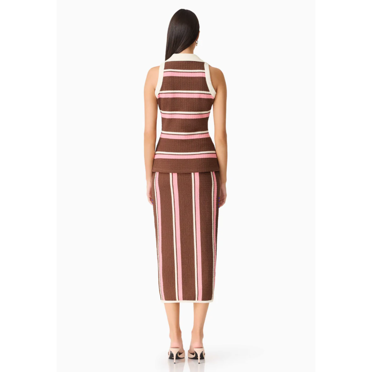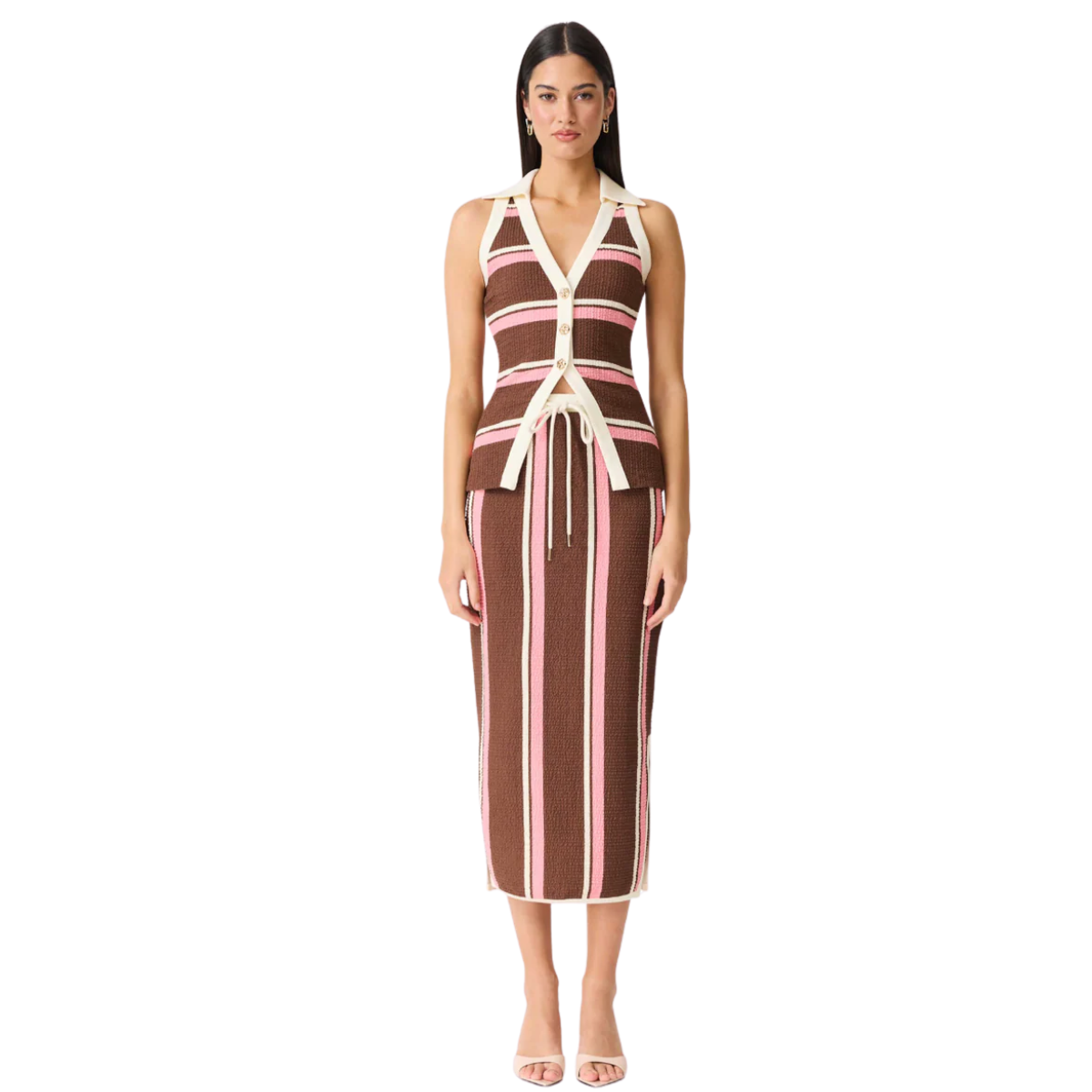 Este vest top tejido combina un aire retro con un toque moderno y femenino. Presenta escote en V, cuello tipo polo y cierre frontal con botones que estilizan la silueta, mientras el diseño sin mangas lo hace perfecto para climas cálidos. El patrón de rayas en contraste aporta dinamismo y carácter, y el detalle ajustable en la cintura realza la figura de forma favorecedora.