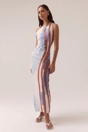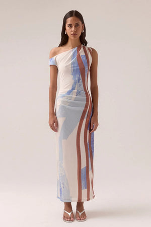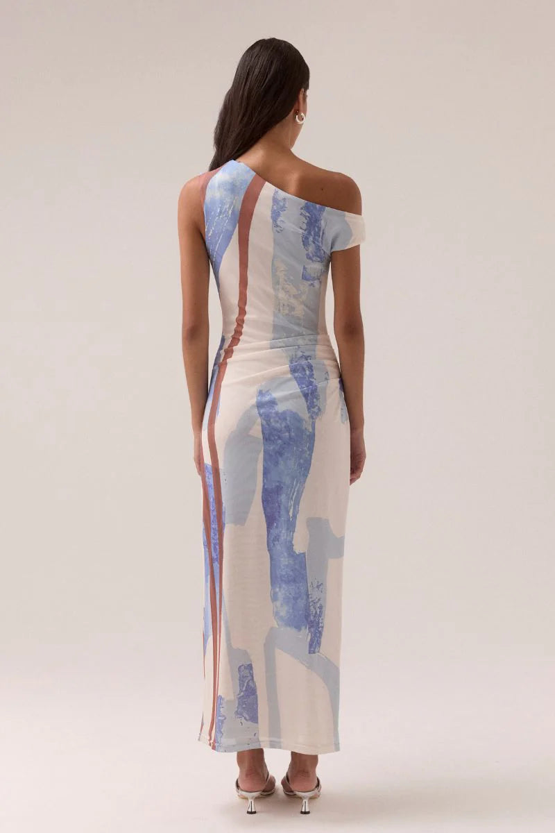 Crafted from stretch mesh with a unique in-house print, this fitted off-shoulder maxi dress elegantly contours the silhouette. Featuring a subtle tuck detail and a sleek column skirt, it offers refined structure and ease with its pull-on design. Fully lined for comfort, this dress balances sophistication and effortless style.