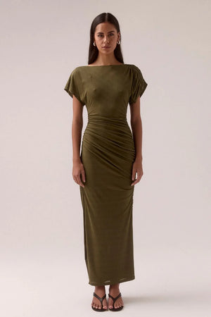- Textured stretchy mesh fabrication- T- shirt style midi dress- Short magyar sleeve- Gathers at shoulder and body- boat neckline- Gathered panel details on one shoulder and down one side- Split at one side- Pull on function- Fully lined